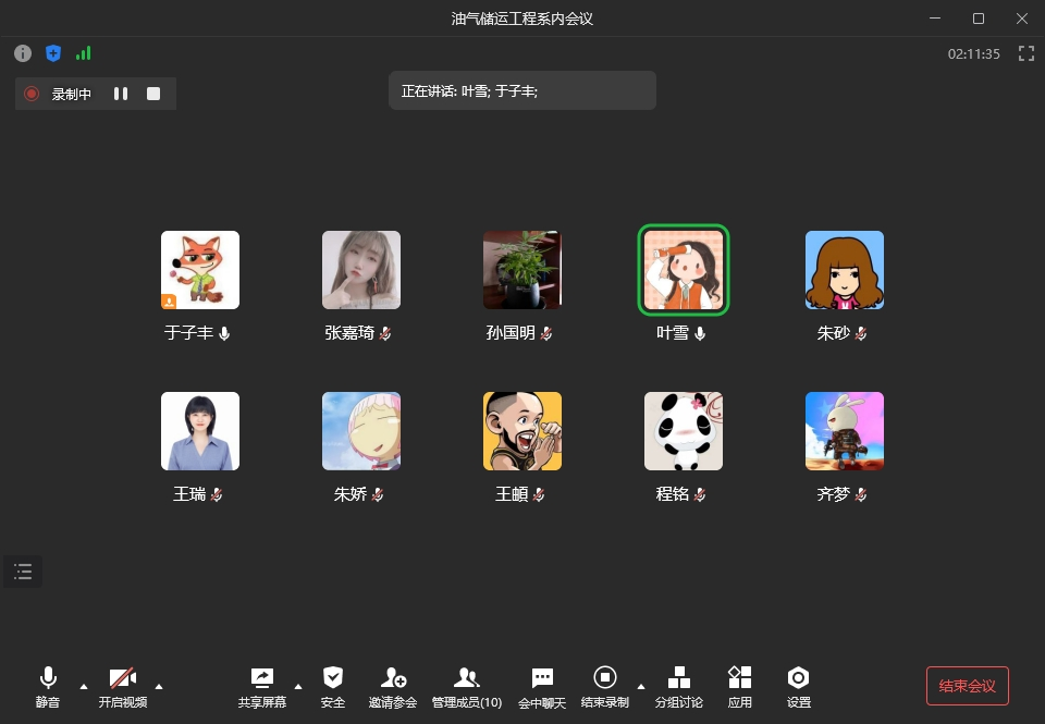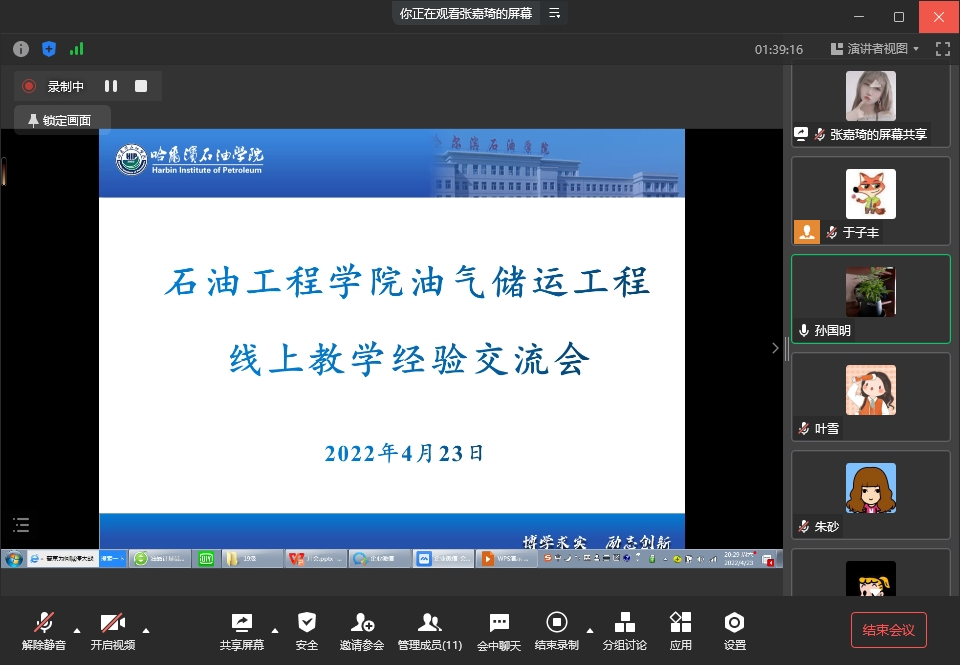 为深入贯彻教育部关于疫情防控期间的高校在线教学工作要求,进一步提高我系教师的线上教学技巧,提高教学质量,我系在2022年4月23日借助“企业微信”平台召开在线教学经验交流会。油气储运工程系主任教授孙国明、院长助理朱砂及油气储运全体教师出席交流会。交流会由于子丰主任主持。