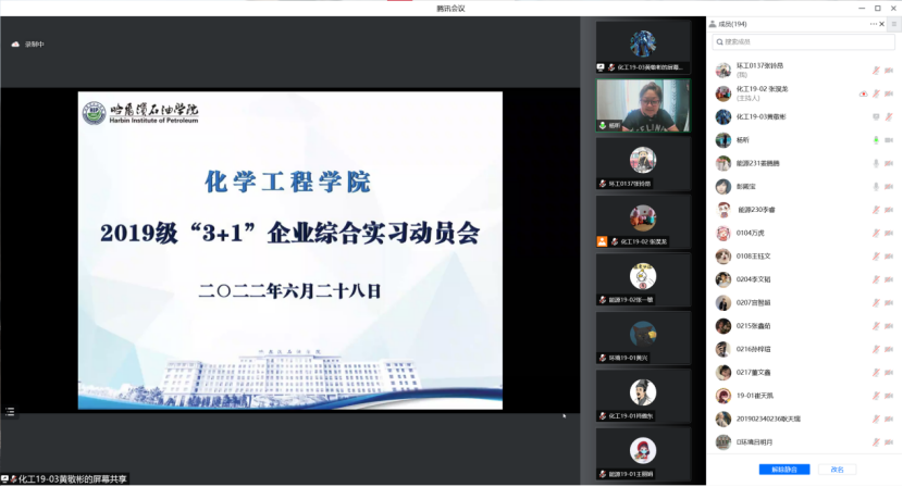 进一步推进高等学校应用型人才培养教学改革进程,提高我院的人才培养质量,全面落实2019级学生“3+1”企业综合实习工作安排,让学生明确实习的目的、意义及要求,2022年6月28日14时30分,化学工程学院通过腾讯会议线上召开2019级“3+1”企业综合实习动员大会,会议由副院长彭殿宝主持,院长杨昕、党总支书记张艳丛、辅导员马志强及2019级全体学生参加。