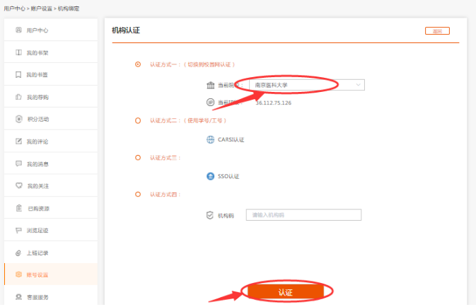 校内IP范围内的用户,进入“用户中心”点击“认证”,选择“认证方式一”,即可实现“IP认证”。用户IP认证后,每次享有最长60天的离校访问权限。