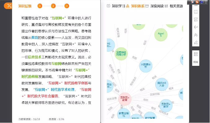 “知识阅读”是一种阅读与知识体系完美融合的阅读方式。“可知”知识服务平台通过对知识点挖掘、知识体系构建、信息分析,在细分领域内实现知识点体系化,根据知识点关联各种类型资源,供读者进行网络化、体系化阅读。让读者在阅读一本电子书时,既可以学习与之相关的知识点解释,还可以根据知识体系的指引快速获取关联知识内容和资源进行系统性连贯学习。