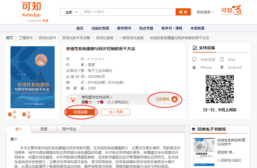 在查找到想要的资源后,可点击图书封面进入图书详情进行试读和荐购。