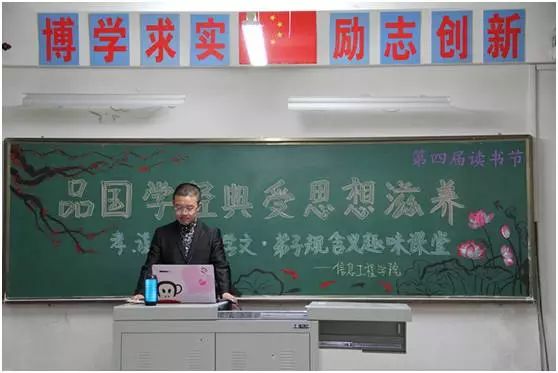 为了更好的弘扬传统文化,提高同学们学习国学经典的主动性和积极性,充分了解《弟子规》的含义与内涵,我院信息工程学院于2016年4月28日在二教401为大家带来一场以“品国学经典 受思想滋养”为主题的特别新颖的弟子规含义趣味课堂。本次活动以第四届读书节“文明修身从读书开始”为主题,选取弟子规< 孝>< 谨>< 信>< 余力学文>四个篇章,为大家带来更深入的内容意思讲解,与以往的活动形式不同,此次活动以模拟课堂形式展开,并伴有同学们录制的视频来向大家展示弟子规的重要性。此次课堂的两位教师由学生扮演,为大家带来了一堂表演课,让大家更好的了解弟子规真正的内涵,做到了趣味性和学习的含义内容相结合,做到了寓教于乐,让大家通过不一样的方式再一次的认识了解了《弟子规》。