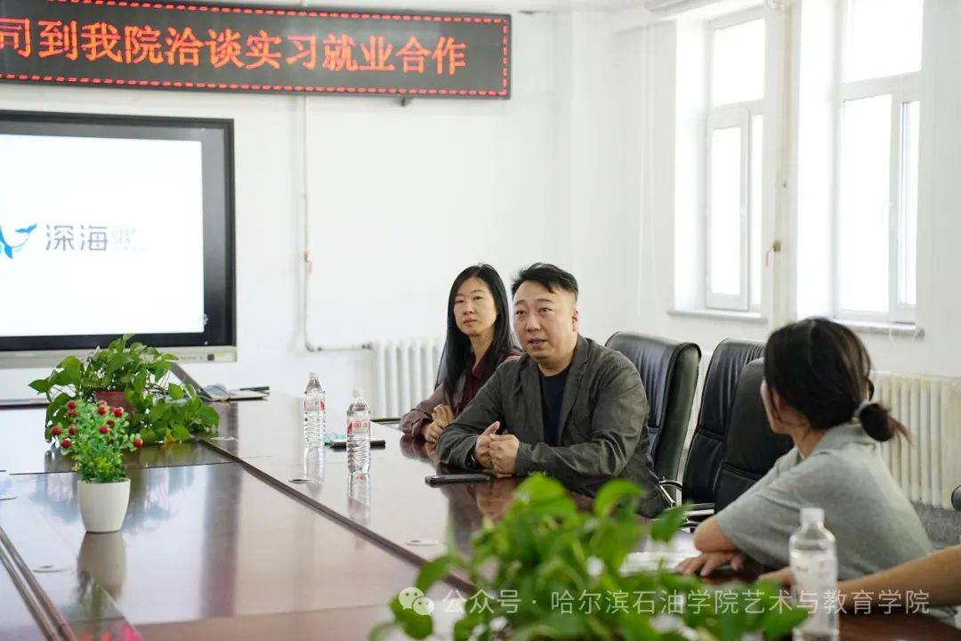 5月17日,为了进一步加强艺术与教育学院与市场及企业的联系,并为学生提供更多实习和就业机会,广播电视编导专业教研室邀请了哈尔滨深海策划有限公司来校进行实地考察和交流,旨在推动校企合作向更深层次发展。此次活动由学院党总支书记刘强、广播电视编导专业系主任时郁婷、教师孟令贤及2021级广播电视编导专业学生共同参与,我院对深海策划有限公司负责人林总一行的到来表示热烈欢迎,座谈会气氛热烈友好。