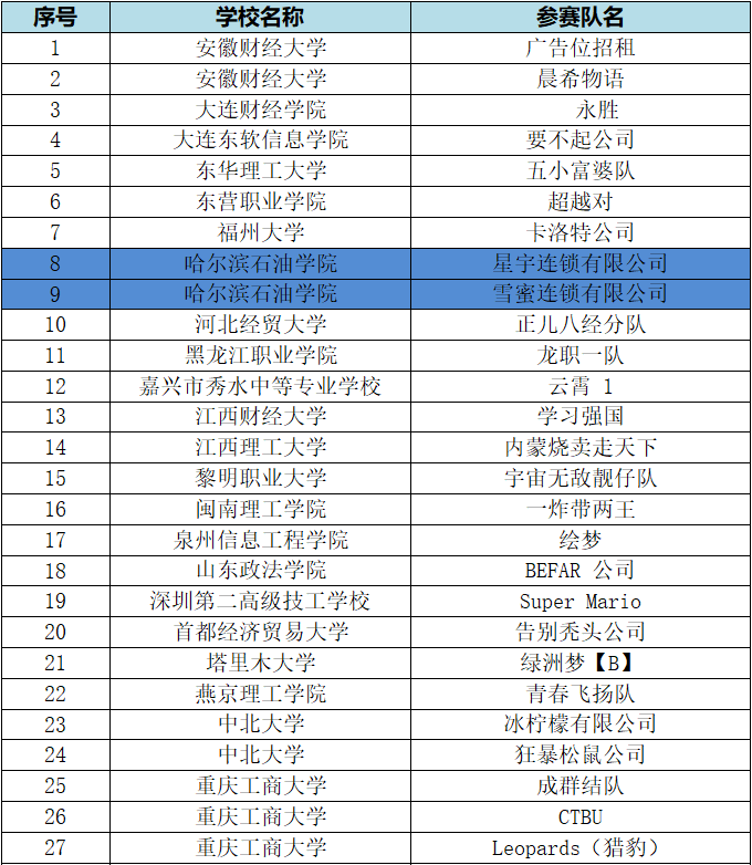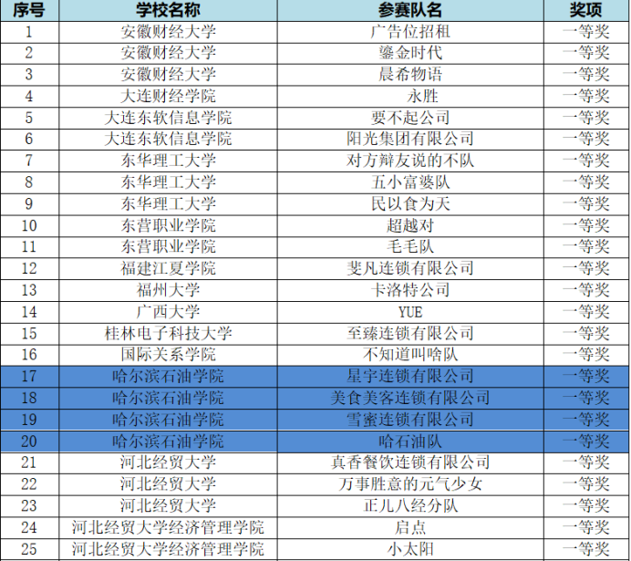 比赛过程异常激烈,经管学子面对强手,毫不畏惧,敢于拼搏,用自己的实际行动,践行着哈油精神。本次大赛分多个模块,小组成员各司其职,密切配合,共同分析并预测市场形式,每期比赛后,根据本期市场情况制定下一期的战略。最终由王汐浩、高宇航、张宇、马巧凌、白思琪、李玉梅六名同学组成的“雪蜜连锁有限公司”代表队,王晓慧、王广昊、李美洋、高海凤、陈兴宇、纪星月六名同学组成的“星宇连锁有限公司”代表队脱颖而出,分别取得了国家级一等奖的优异成绩,并以小组第一的优势顺利的进入下一轮精英赛。由刘洲、霍增玉、董梦迪三名同学组成的“哈石油队”代表队,及由张媛媛、屈剑飞、刘梦佳、李英超、彭益凡六名同学组成的“美食美客连锁有限公司”代表队也脱颖而出,获得了国家级一等奖的优异成绩,由阿里玛、才佳仪、丁思佳、耿启轩、黄婉、晋胜楠六名同学组成的“御食府连锁有限公司”代表队获得了国家级二等奖的优异成绩。