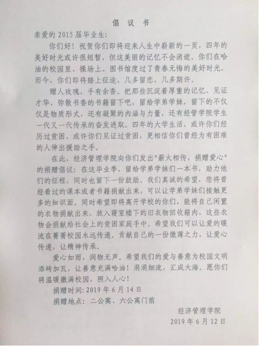 感恩奉献,与爱同行,经济管理学院于6月15日至20日,在第二学生公寓和第六学生公寓开展“一份爱心,一份温暖”捐书捐衣物献爱心活动。