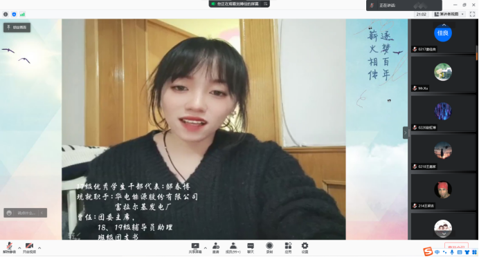 优秀学生干部王尹钰同学,张福鑫同学也讲述了他们从新生就开始努力学习,提高工作能力并且为我院团支部以后能再次创建新的全省五四红旗团支部提供了宝贵的经验。