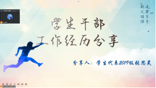 优秀学生干部代表张思昊在学生干部工作经历分享中,讲述了许多他自己的经历与处理事情的方法,大学期间要努力提高自己的综合素质,要培养兴趣爱好,丰富课余生活,积极参加各种活动。