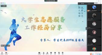 我院优秀学生干部代表唐国文、彭玉还向同学们分享作为大学生志愿服务者、特色学生活动组织者与参与者,在日常工作中应该如何与同学交流、老师相处;怎样提高自己的工作效率,提高自己的工作能力;坚持以服务同学、办特色活动为宗旨。