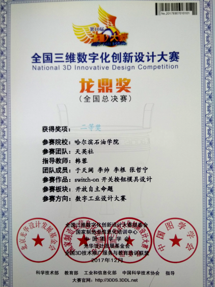 为提高学生对科技、创新以及本专业的学习兴趣,机械工程学院由韩蓉老师指导的“天英社”团队于2017年12月6日参加在云南省玉溪市举办的第十届全国三维数字化创新设计大赛年度总决赛获得全国二等奖,本赛事的宗旨在于提高现在大学生对三维、科技、创新的学习和改革。