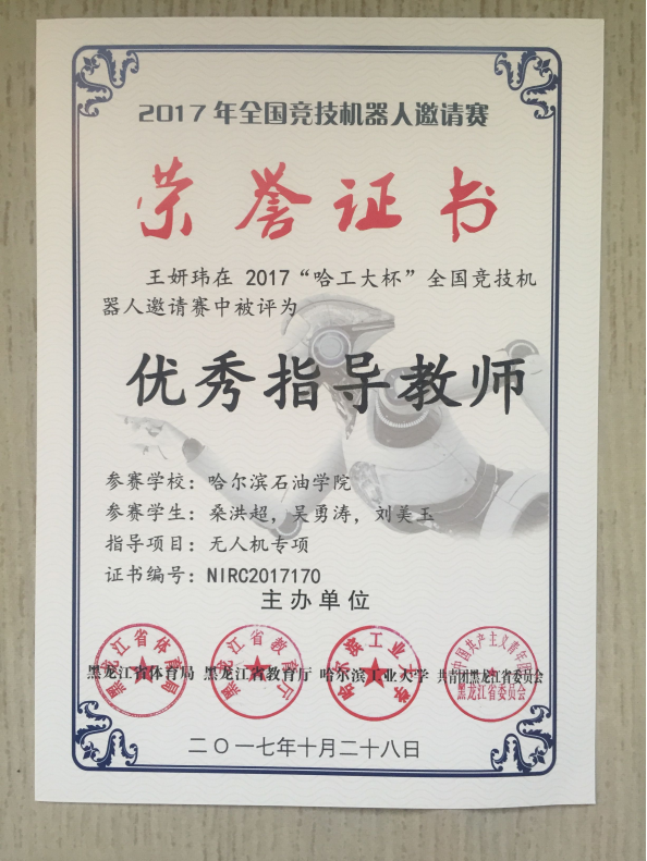 据悉,此次2017全国竞技机器人邀请赛的举行旨在培育拓展群众性竞技体育项目,扩大人工智能类竞赛的覆盖面,通过本次比赛,充分宣传和展示黑龙江省高校和科研院所在人工智能研发领域的科研成果和技术优势,进一步促进我省人工智能科研成果转化,实现“体育+科技”的融合。机械工程学院自2017年9月组建机械学院航模社团,结合2011年机械学院机器人创新社团,每周三晚上王妍玮老师都对参赛学生进行集中辅导,通过辅导,培养学生的创新意识和创造能力,训练学生动手实践和调试的能力,培养团队合作意识和团队合作精神,增强学生语言表达技巧,比赛期间,王妍玮老师也获得了大赛优秀指导教师称号。