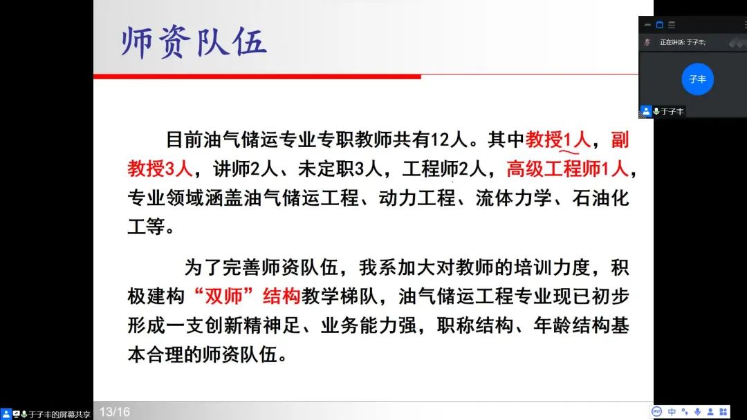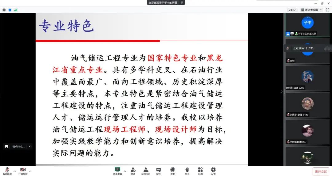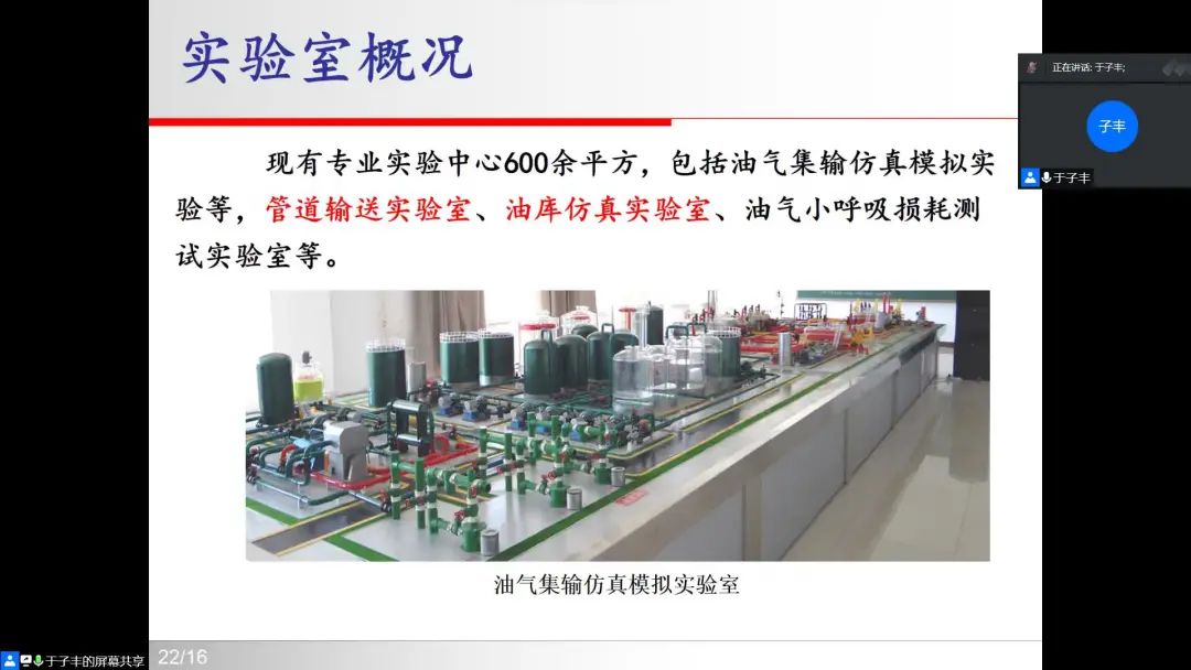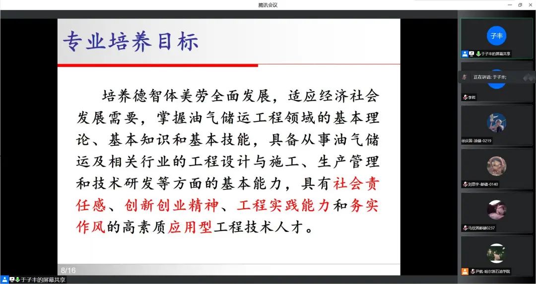 为帮助2022级新同学更好的融入大学生活,培养专业情志,实现自我价值。9月5日,我院在线上开展专业情志教育讲座。本次讲座由我院油气储运工程系主任于子丰、石油工程系主任胡旭、实验室主任刘鑫、油气储运工程系教师叶雪和油气储运工程系教师李井洋主讲,全体2022级学生参会。