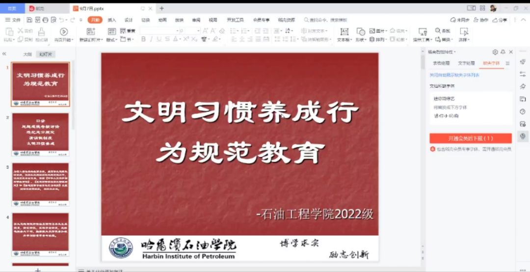 为了提高我院2022级新生的文明习惯养成意识,加强行为规范教育,我院于9月6日在线上组织新生开展以文明习惯养成规范教育为主题的思想教育课,会议由2022级新生辅导员尹航主持。
