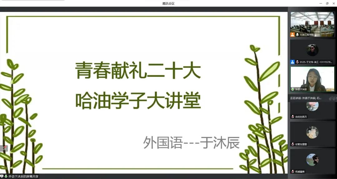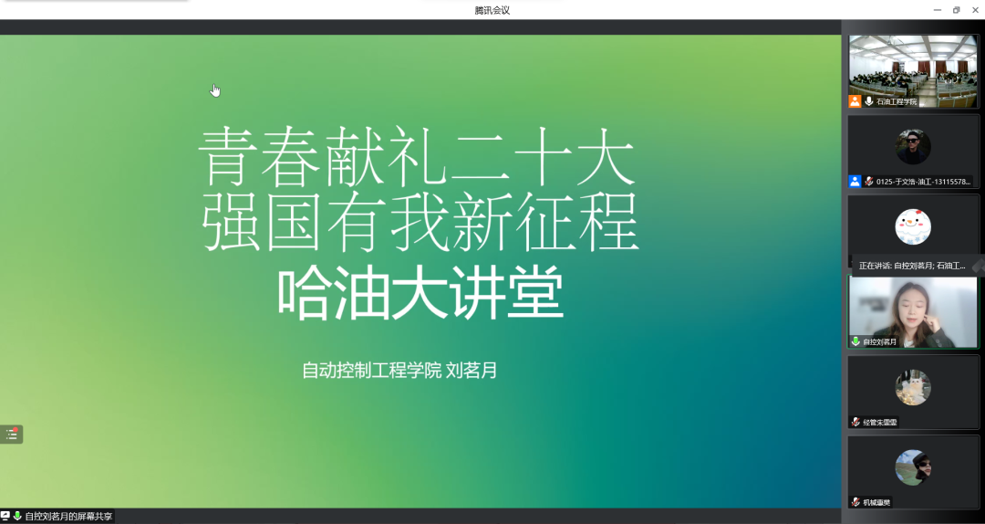 为进一步提升学生思想政治教育,提高学生对于国家和社会的认知程度,提升太阳成官网学生的综合能力,10月25日,我院开展哈油学子大讲堂线上宣讲活动。我院党总支书记刘雁春、2022级辅导员尹航出席本次活动。