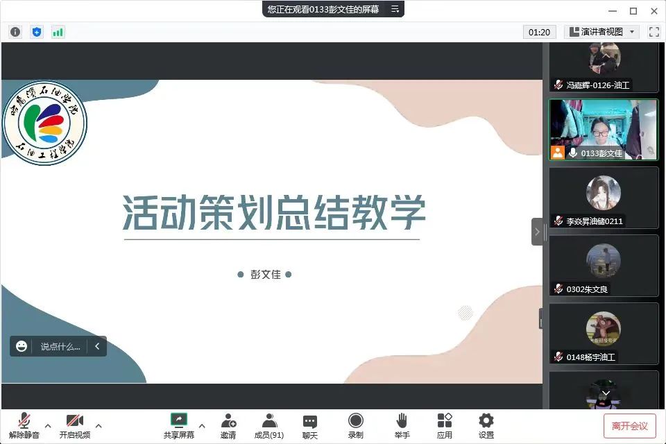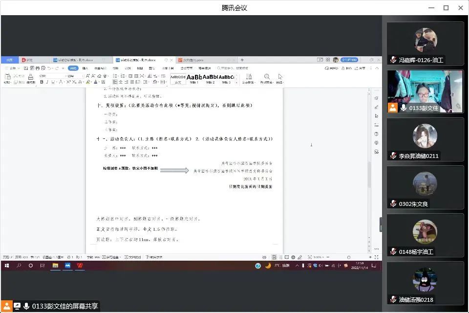 为了提高学生综合素质,紧密结合学院工作实际,认真学习、深刻领会、全面落实党的二十大精神,贯穿于学院高质量发展各方面,同时提高学生干部的全方面工作能力、工作效率和工作积极性,培养复合型人才,落实各部门的职责,做好总结和宣传工作,端正工作态度,从而更好的服务同学,11月14日,我院主席团成员彭文佳在腾讯会议开展学生干部能力提升培训。本次学生干部能力提升培训会旨在使学生干部进一步了解策划总结等活动格式,同时也对这两方面提出了不同的要求。会上详细的介绍了策划的格式要求和内容顺序,要求学生干部深化改革,具备一定的工作能力。